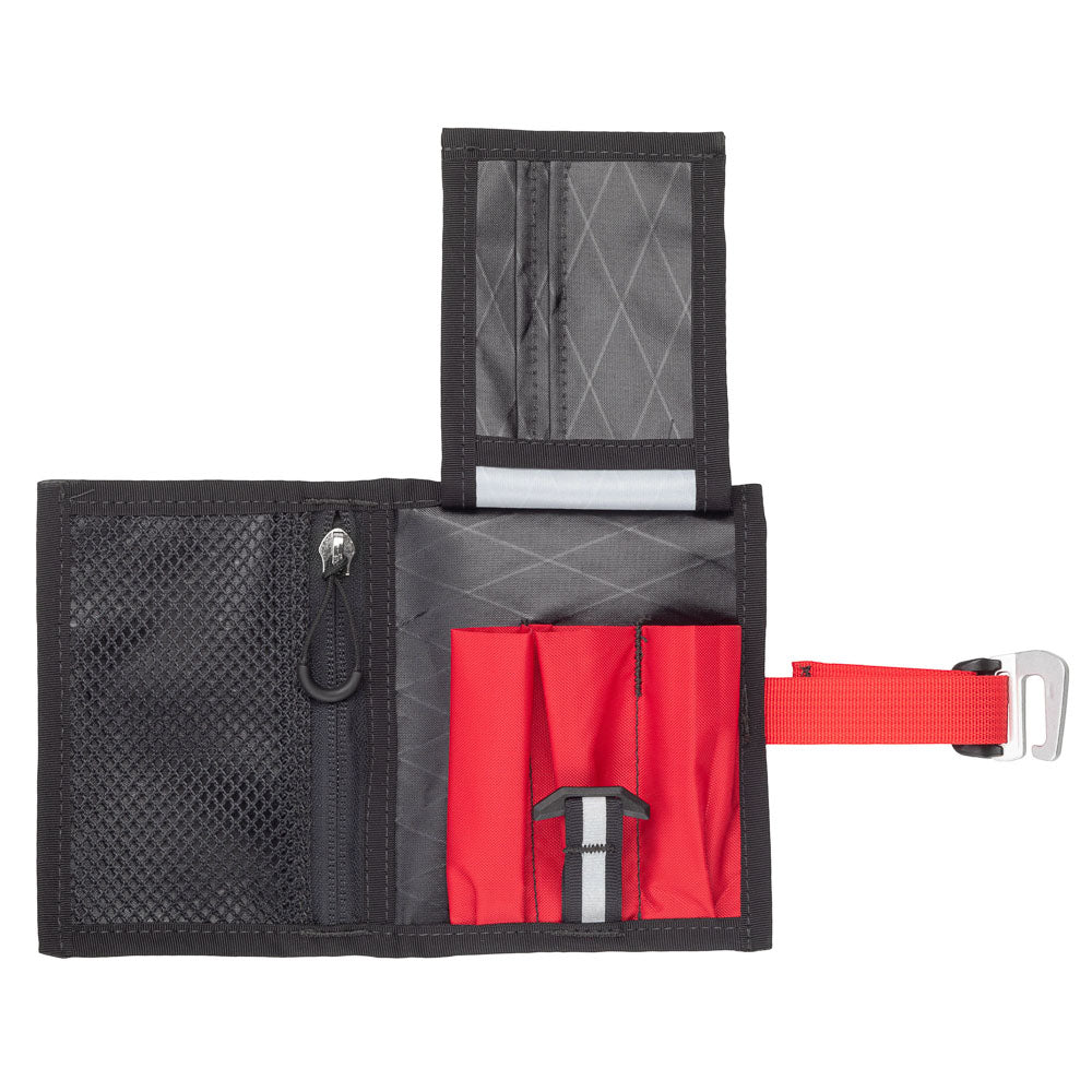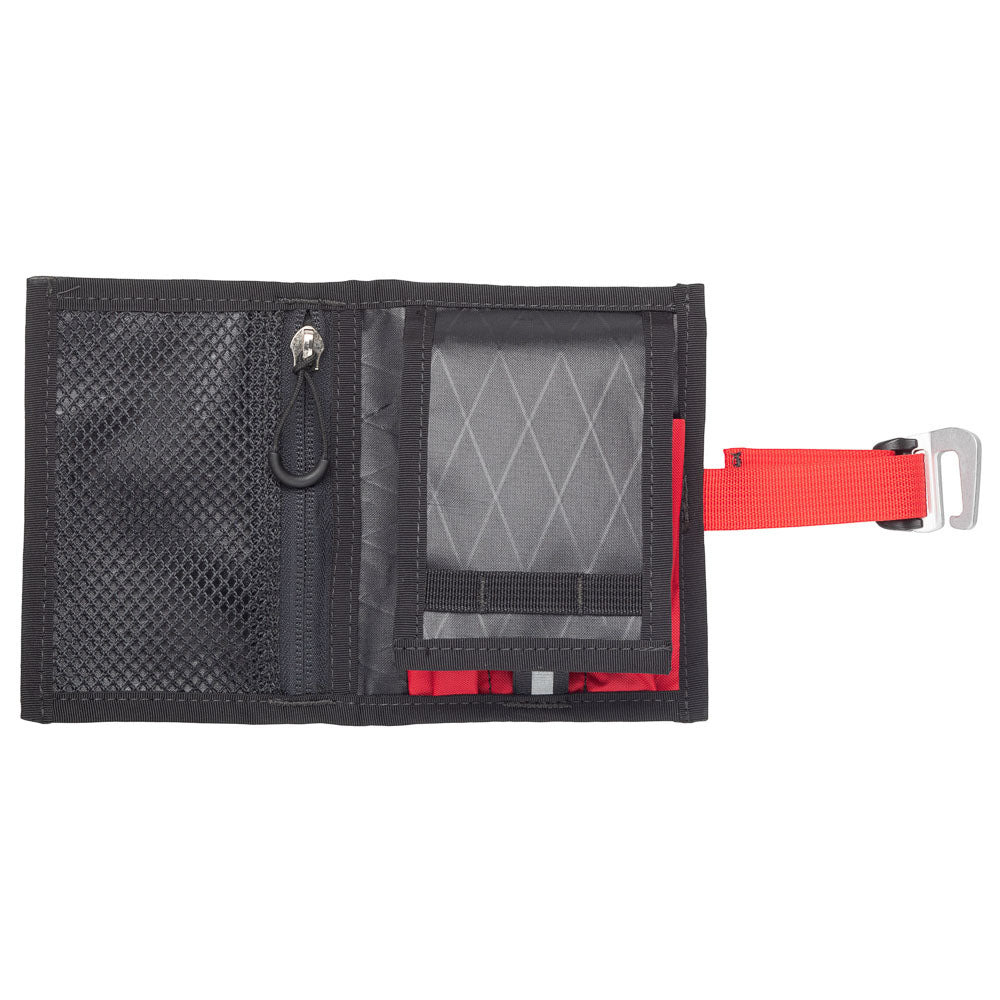 Weighing just 56g, the ToolCash is a robust organizer for riding necessities. Built with Revelate’s proprietary abrasion resistant VX, the bi-folds of the ToolCash feature a zippered pouch on one side, and a mini tool roll with three open ended slots on the other. The fold-out wallet features two card slots and a slide pocket. In addition to providing space for bank cards, the fold out secures the tool slots and is fastened by internal toggle. A sleek aluminum hook serves as an external closure.