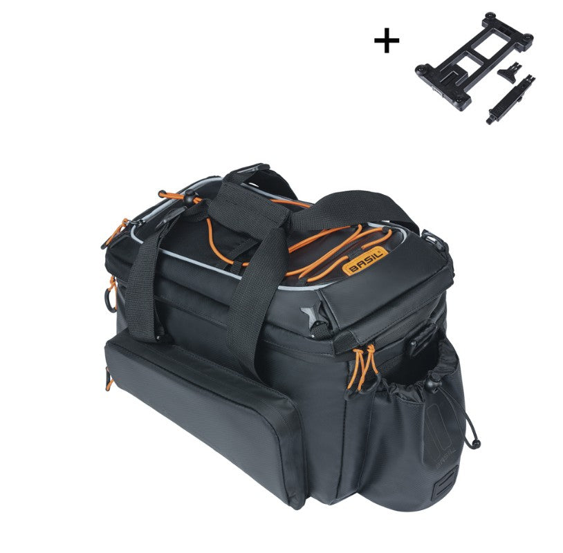 Are you looking for a bag where everything has been thought of? Then the Basil Miles Tarpaulin XL Pro trunkbag is your go-to. This sporty bag is waterproof and has many handy features. It has two waterproof, foldable side pockets, and the top compartment is also expandable. The 9-litre capacity can be expanded to a whopping 36 litres. Furthermore, the black bag with orange details has an extra insulated pocket for a water bottle and extra dividers so that you can split the main compartment. To keep food and drinks cool, there are two compartments for cooling packs.