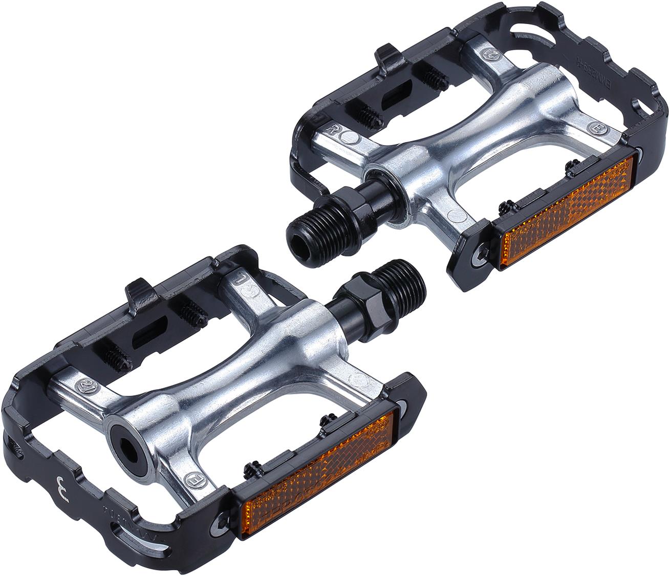 A super strong, heavy-duty aluminum pedal. The aluminum body is super strong but lightweight, while the cage makes sure your feet have a big surface to rest on. The surface is covered with a special pattern that keeps your feet on the pedal, you got as much grip as possible. And last but not least; reflectors on both sides of the pedal to make sure other people will see you on your bike in the dark. Safety first!