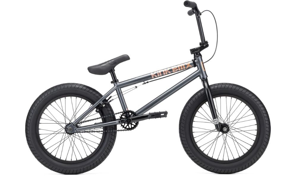 The Kicker 18” is built with younger riders in mind who aren’t quite ready to make the jump to their first 20” bike. With similar components to the Kink Launch but sized down for younger and shorter riders, this bike doesn’t compromise. Features like the wide tires, 3-piece cranks, sealed bottom bracket, and integrated headset are the same as what you would expect on a proper BMX bike. This year the Kicker comes in an awesome Gunmetal Gray colorway and is paired with all black components.