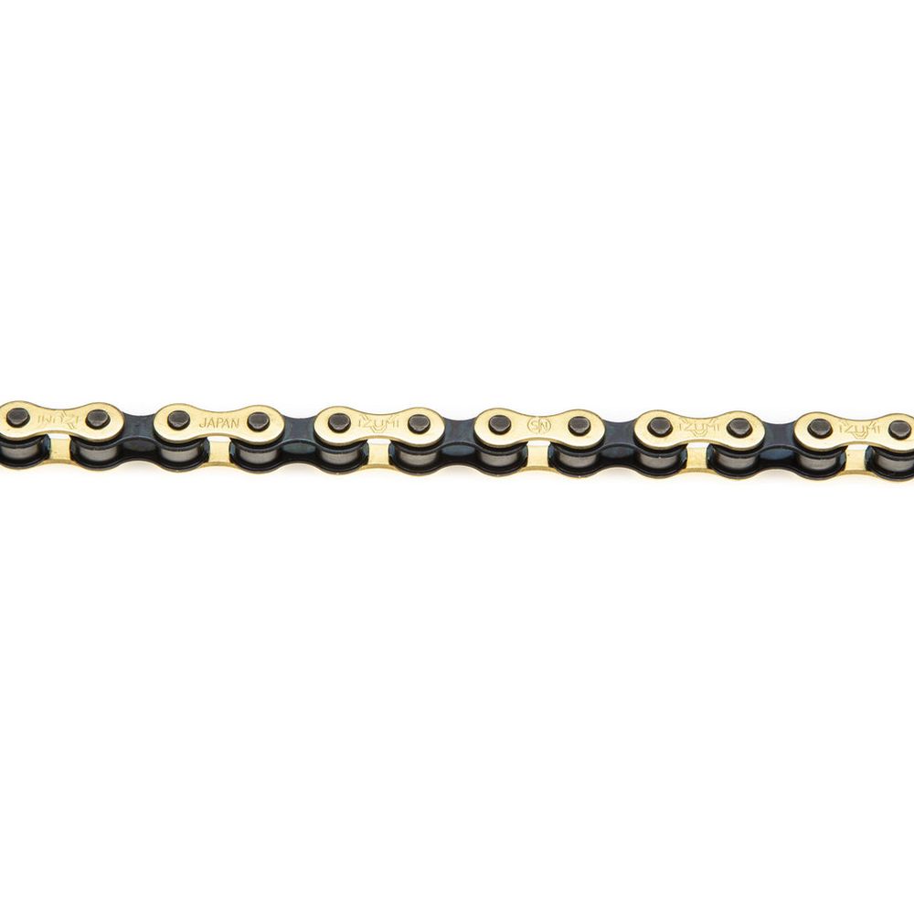 One of the few chains that meets the strict certification requirements of the Japanese Keirin Association (NJS), the Izumi-V is renowned among keirin racers for its strength and efficient power transfer. The proprietary surface treatment increases abrasion resistance and creates the striking contrast of gold outer plates against midnight-blue inner plates.