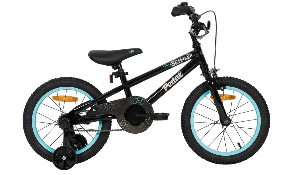 The Pedal Buzz 16" Kids Bike is built to help young riders transition smoothly from training wheels to riding on their own. Its sturdy steel frame provides the durability needed for active kids, while the coaster brake and front brake combination ensure safe stopping power. With removable tool-free training wheels and child-specific components like a soft foam saddle, easy-grip handlebars and a full chain guard, the Pedal Buzz is designed to make learning to ride a fun and comfortable experience.