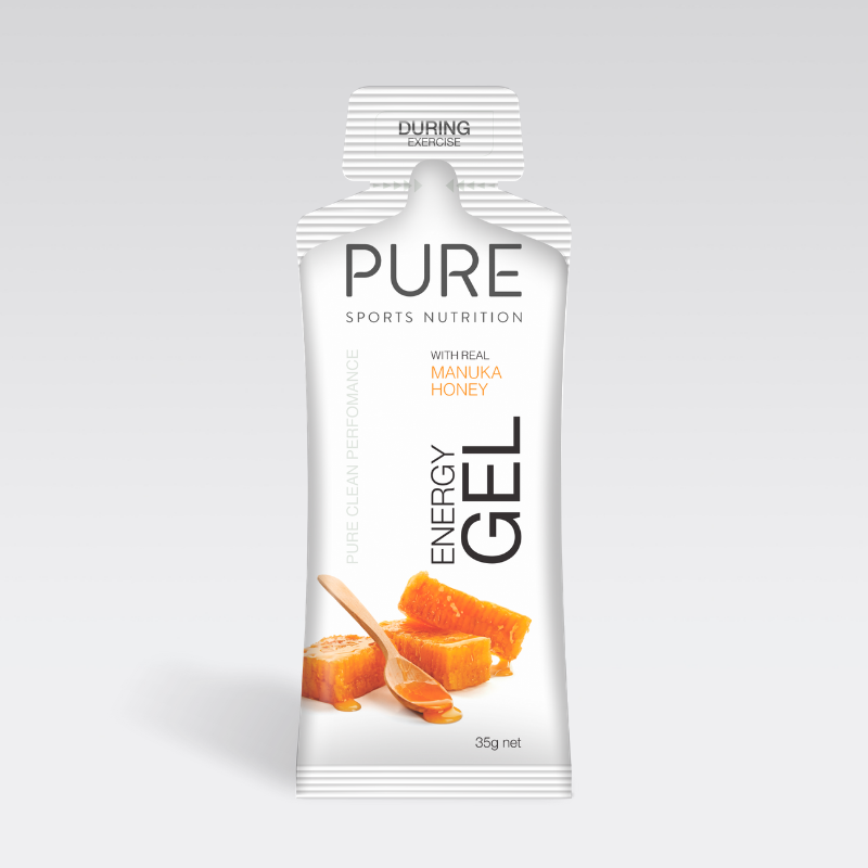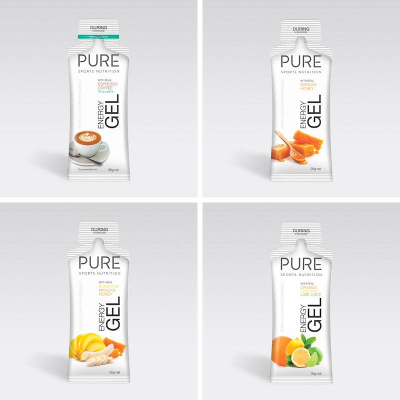 PURE Energy Gels are a premium natural sports gel using real ingredients for flavour, carbohydrates and electrolytes. Available in 4 flavours: Espresso + 30mg caffeine, orange lemon lime, manuka honey, banana & manuka honey. The gels are designed to fuel the body during exercise in a no fuss, easy to use way.