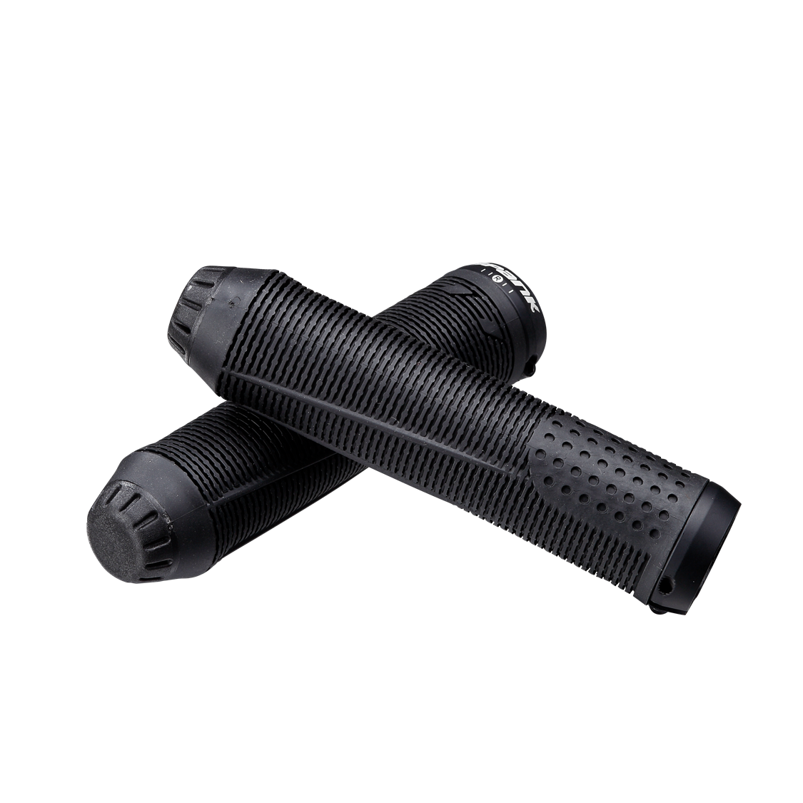 The "Human Factor" interlocking column design on the Spike 33 grips from Spank offers the comfort and durability benefits of a finned grip without unwanted float. The anatomically designed impact-resistant bar end tapers to support and protect the little finger. Internal cut outs at the palm area reduce impulse shock and vibration, adding comfort and reducing fatigue. Three directional ribs at the front of each grip and flare at outboard end add traction in any conditions.