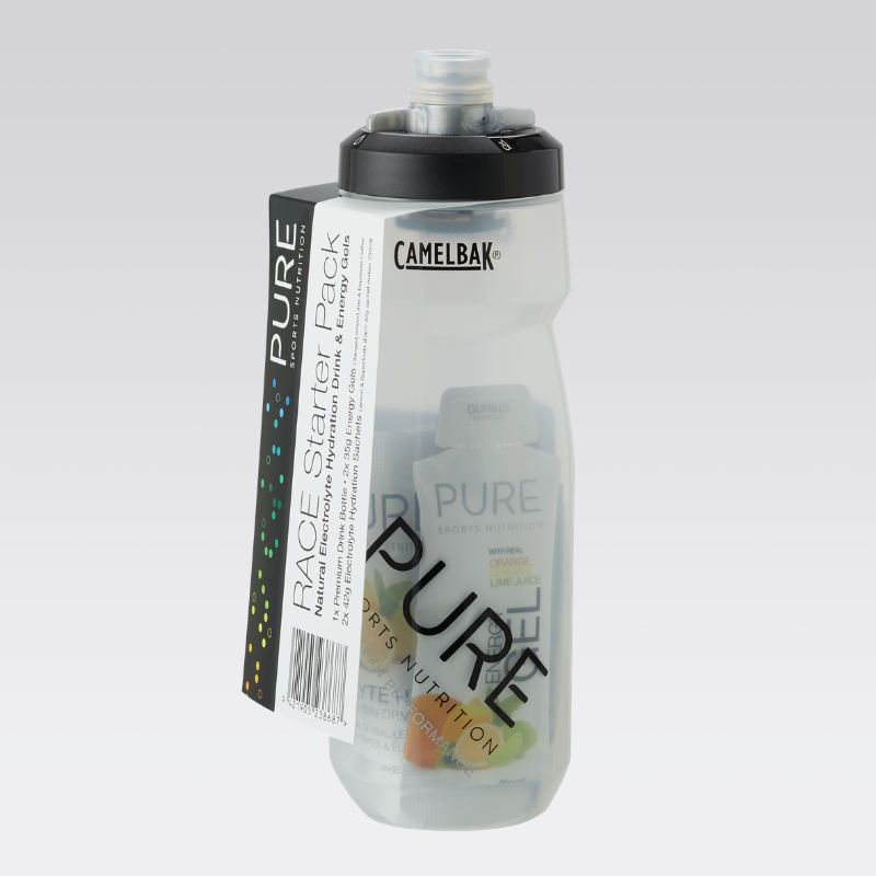 The Race Starter Pack contains the complete package to hydrate and fuel for 2-3 hours. Includes: PURE Electrolyte Hydration - a premium natural electrolyte drink base using real freeze-dried fruit, carbohydrates and electrolytes, PURE Energy Gels - a premium natural sports gel using real ingredients for flavour, carbohydrates and electrolytes and the PURE CamelBak Podium  - which redefines the bike bottle with a high flow rate and self-sealing cap. A great gift idea for any fitness enthusiast or to lock in your own race-day nutrition.