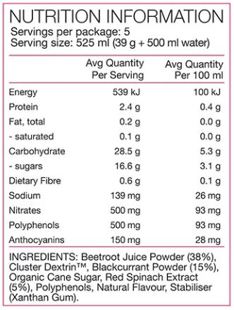 INGREDIENTS: Beetroot Juice Powder (38%), Cluster Dextrin™, Blackcurrant Powder (15%), Organic Cane Sugar, Red Spinach Extract (5%), Polyphenols, Natural Flavour, Stabiliser (Xanthan Gum).