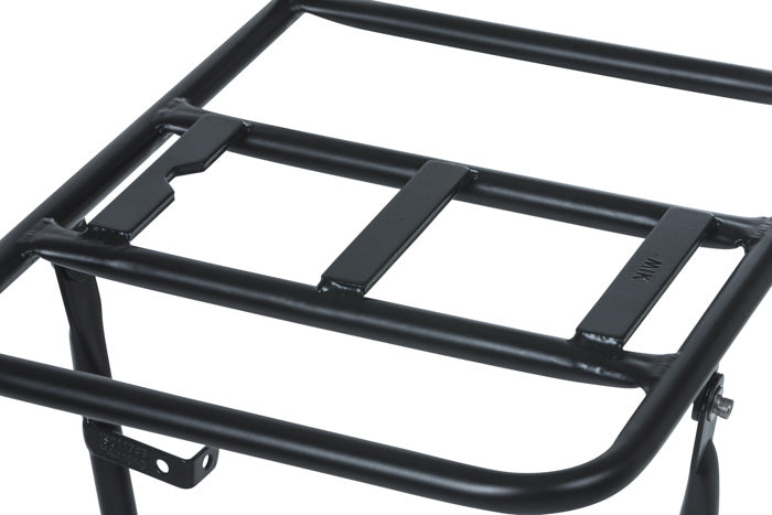 The Basil Front Carrier L is a strong and large front carrier - a perfect tool to hold a large bicycle crate. With a maximum weight capacity of 10 kilograms, the front carrier is also ideally suited for a heavy backpack filled with schoolbooks or a bag with groceries. The front carrier is equipped with MIK profiles, making it compatible with Basil's MIK (Mounting is Key) system. This allows crates to be clicked on and off the carrier with ease. It is quick to assemble thanks to the brackets on the front axle, but cannot be used in combination with sprung front hooks. The front carrier has two adjustable handlebar hooks and a mount for a bicycle light.