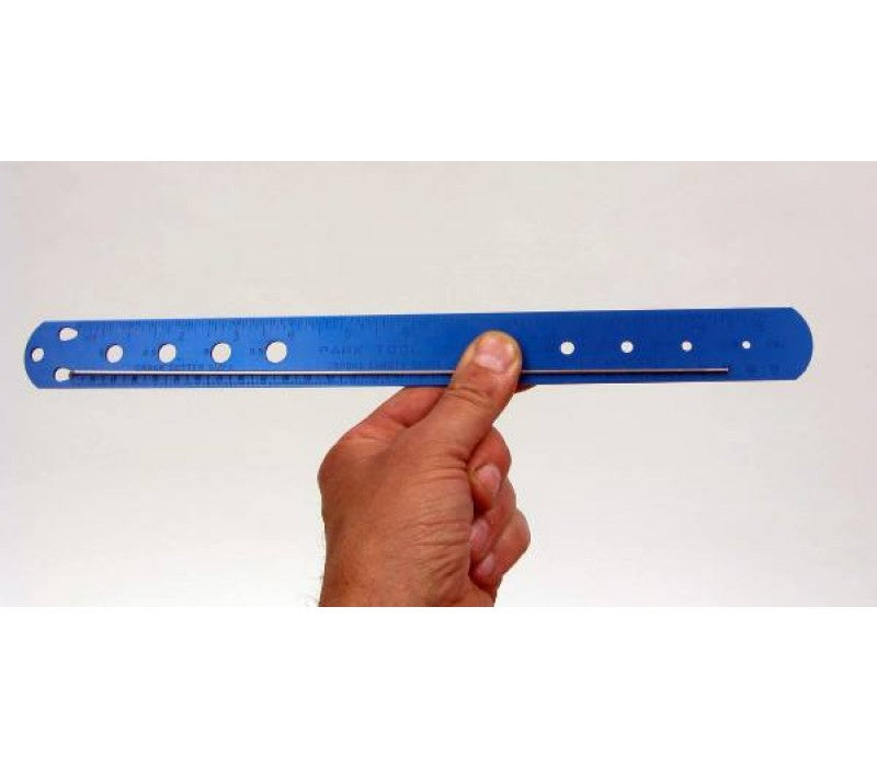 This handy shop aid is ideal for sizing spokes, ball bearings and crank cotters. To use, just hang the head of the spoke in the oblong hole and read its length on the scale. For crank cotters and ball bearings, it works just like a gauge for drill bits. Spoke lengths are in both metric and fractional markings. Made of anodised aluminium with embossed markings to allow easy reading and long life.