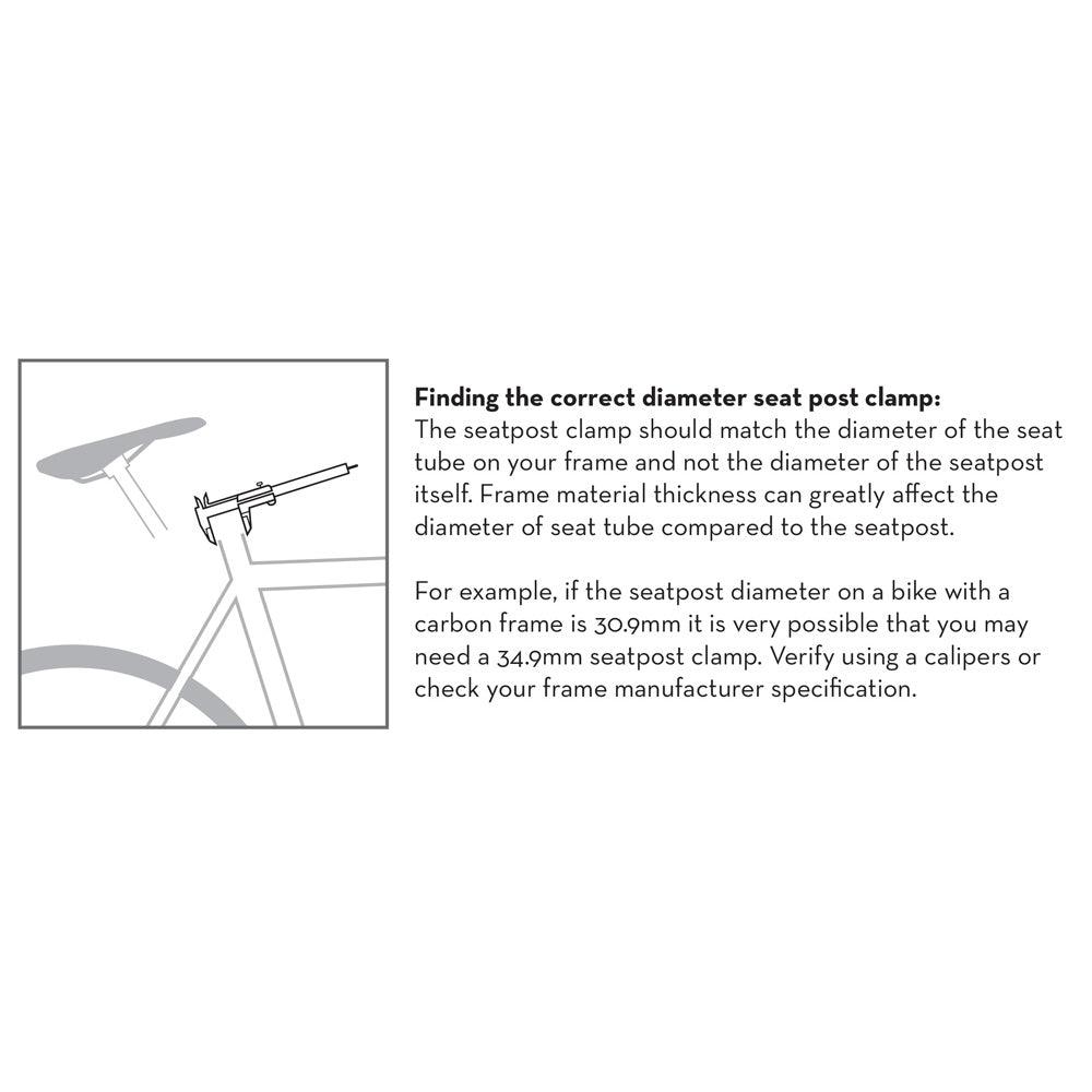 Frames may vary slightly from the nominal diameters due to tolerances and paint thickness. Clamps will fit on frames that are within +/- 0.5mm of specified size. For example, a 34.9mm clamp will fit frames with a seat tube measuring from 34.4mm to 35.4mm in diameter.