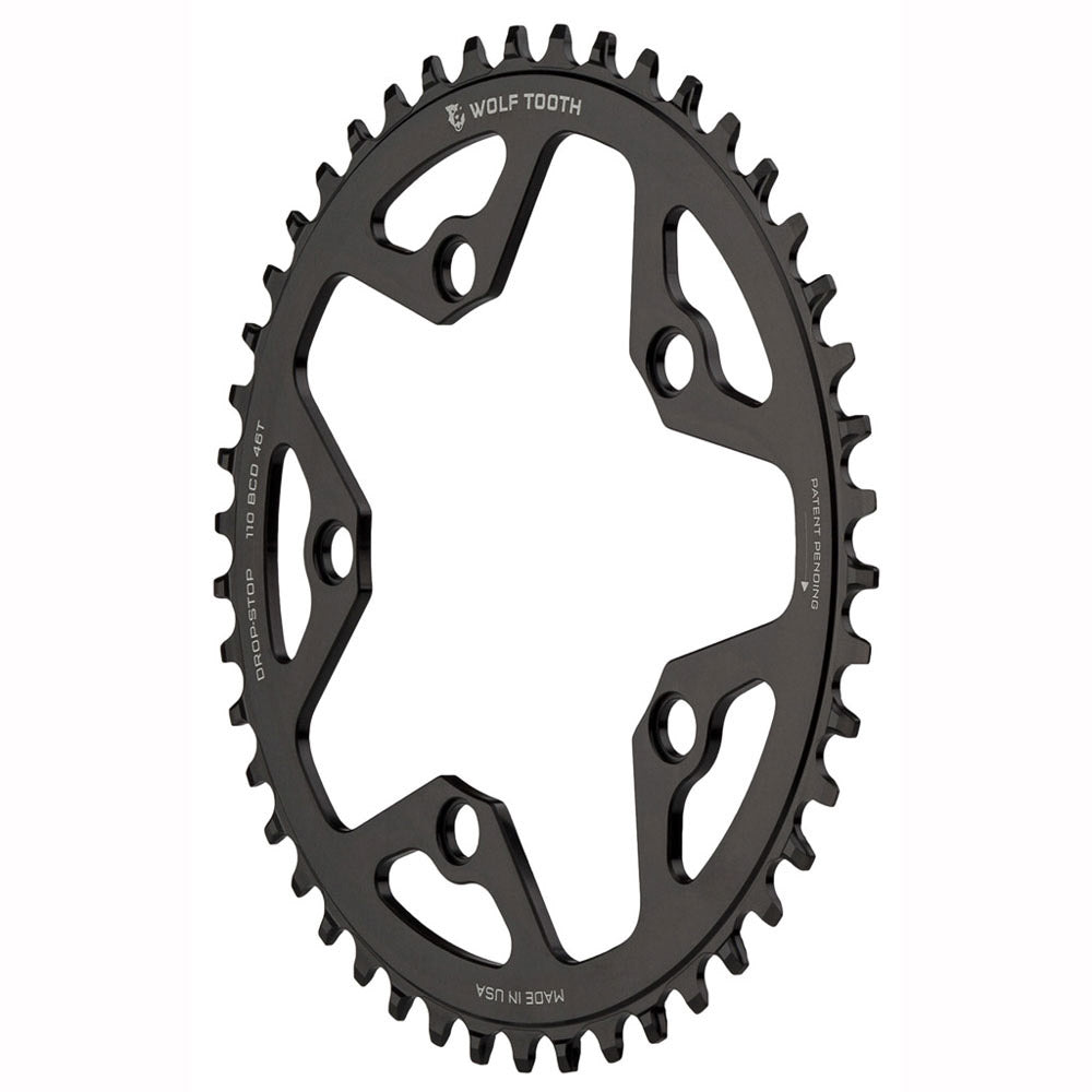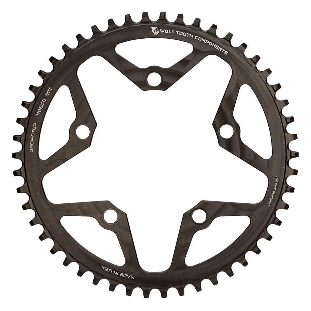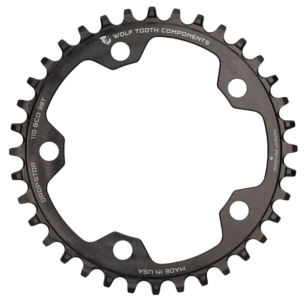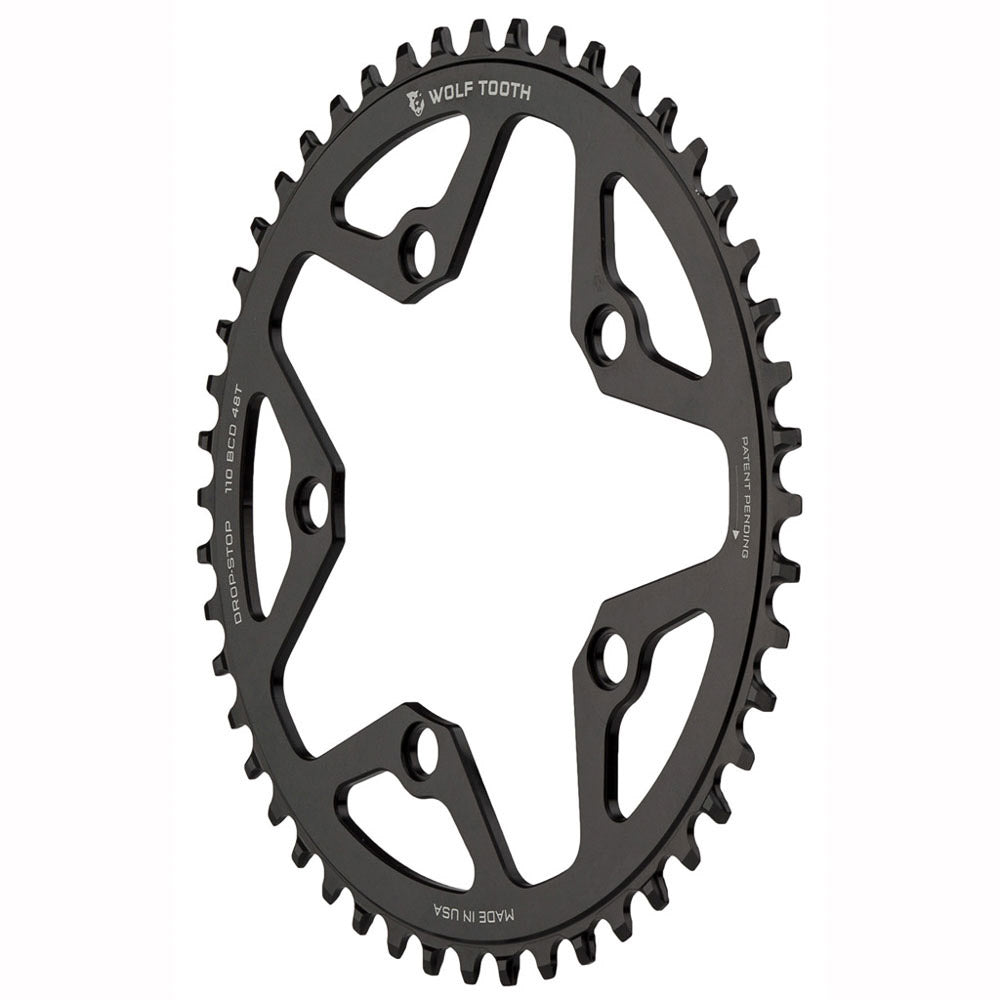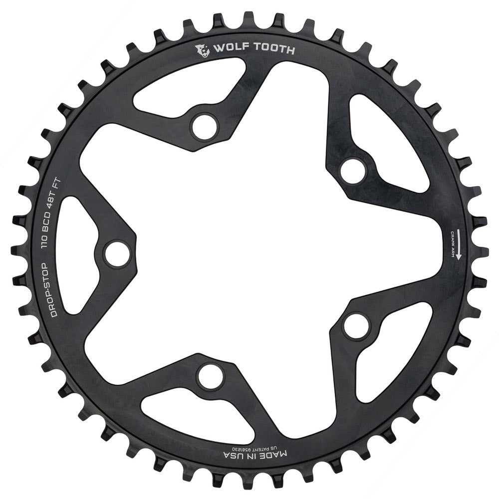 • Drop-Stop technology: On Wolf Tooth’s patented wide/narrow chainring, the wide side of the tooth has maximum contact on the drive side which spreads the load and improves chainring life. The narrow side allows clearance for mud and debris which reduces friction.