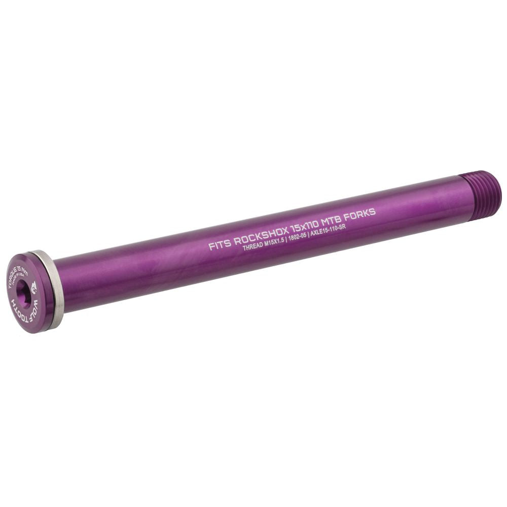 Wolf Tooth Front Axles are lightweight, easy to use, and friendly with your fork. They are available in a variety of colors and lengths for Standard, Boost, and Fat Bike forks. They use a captive steel washer under the head that protects your fork, transfers more of the tightening torque to clamping load for a stiffer interface, and prevents the axle from sticking or galling when you want to remove it.