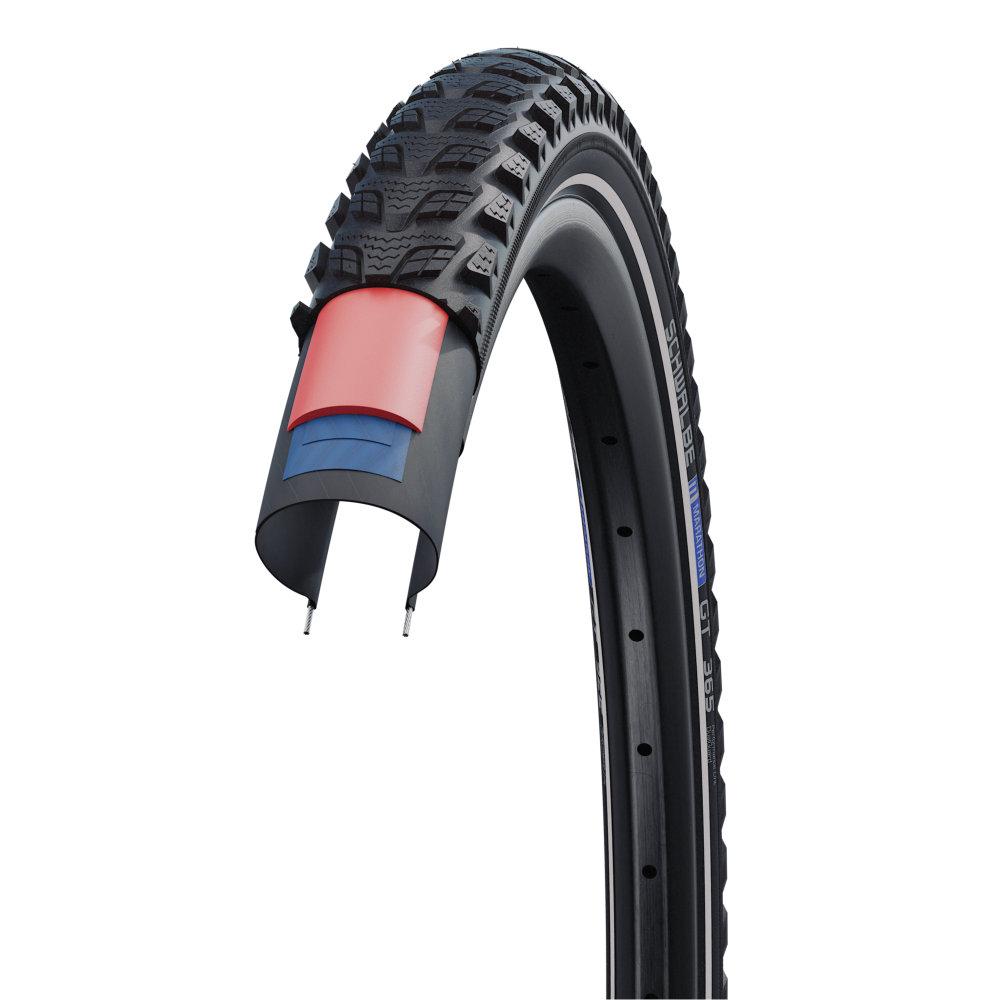 The original: The archetypal high quality touring tire. The highly elastic GreenGuard layer is 3 mm thick. One third of the GreenGuard is made up of recycled latex products. The “Anti-Aging” sidewall can withstand the typical cracking that results from overloading due to insufficient inflation pressure for much longer. E-Bike Ready. You can choose every Marathon for your E-Bike (E-25). The main sizes are approved and tested for E-bikes up to 50 km/h (E-50).