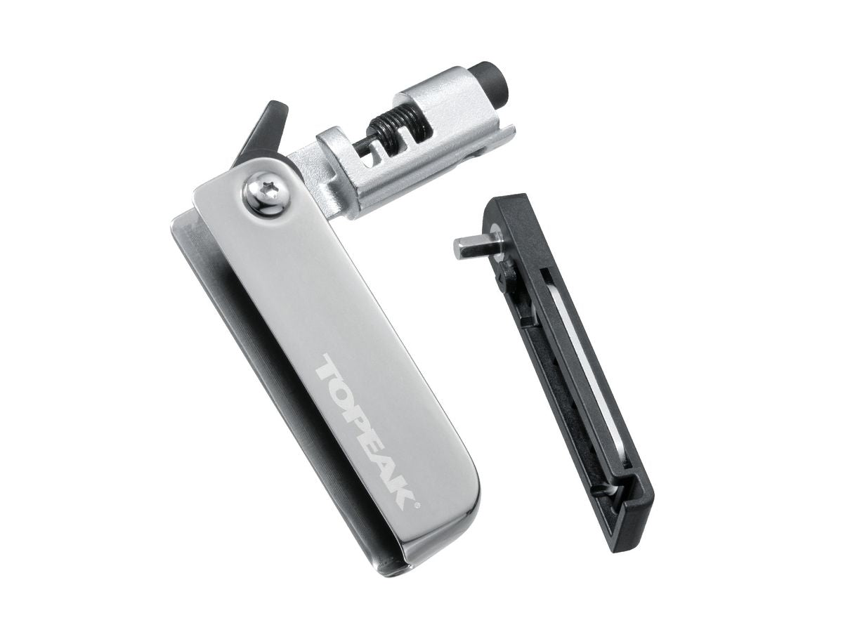 Compact, foldable and high quality metal chain tool for single and multi-speed chains up to 12 speed, including Campagnolo® hollow pin chains. Included chain hook holds links during assembly.
