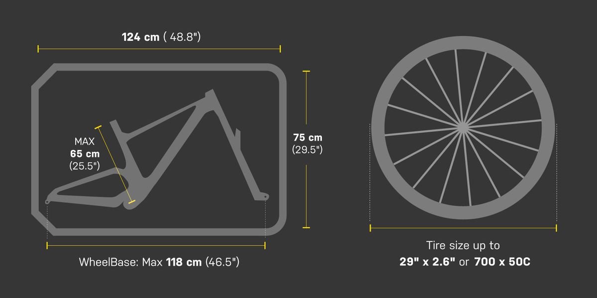 Internal space: 124 x 75 x 30 cm / 48.8" x 29.5" x 11.8" Wheelbases up to 118 cm (46.5”) |