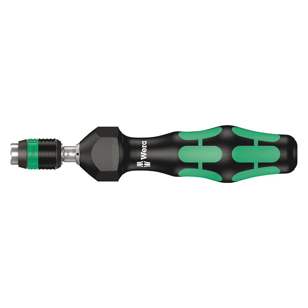 Wera torque screwdriver. Variable torque setting option with highest precision. Simple adjustment of the required torque value without any special tools. Easy-to-read scale value; audible click signal. Rapidaptor quick-release technology for rapid bit change. Unlimited torque to loosen seized screws. Multi-component Kraftform handle with hard and soft zones for high working speeds, whilst being easy on the hand. Suitable for bits with ¼" hexagon head drive as per DIN ISO 1173-C 6.3 and E 6.3 (ISO 1173).