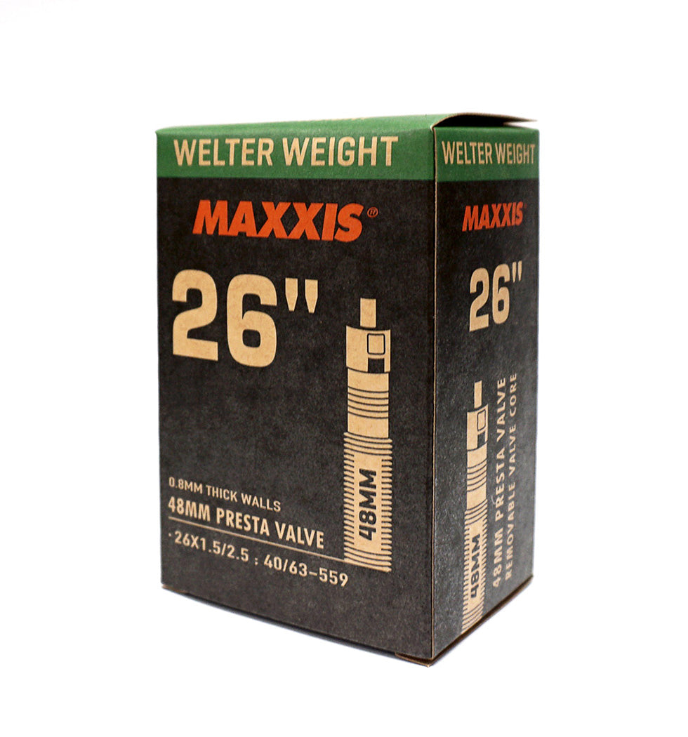 Maxxis Welterweight tubes are engineered for aggressive riders who require durability in their inner tubes. The middle-weight tubes in our line are targeted to downhill racers, dirt jumpers, freestylers, and urban riders.