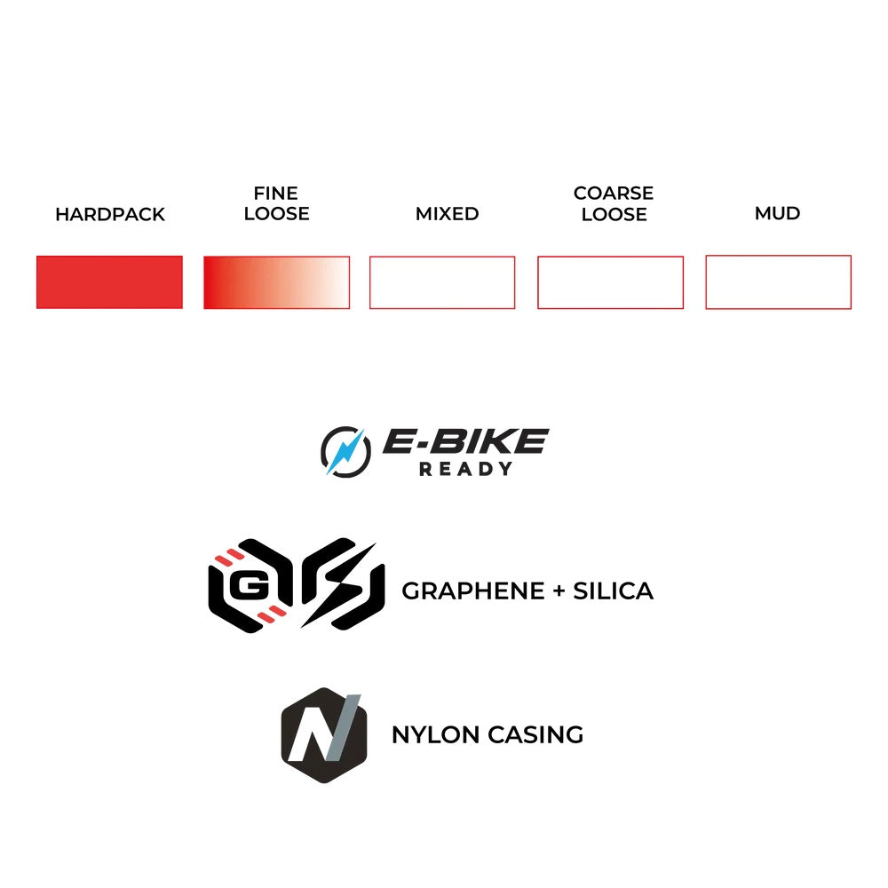 The revolutionary fish scale tread pattern rolls smoothly on straightaways and bites while cornering and braking, and the gradual transition from the center strip to the shoulder knobs takes the awkward bum-up out of cornering. • The Race Formulation Graphene + Silica provides speed and grip without compromise. It is designed to be the absolute fastest option frompoint A to point B.