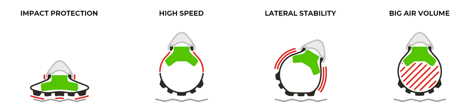 Under air pressure, the insert collapses on the rim creating a seal able to withstand even the strongest impacts.