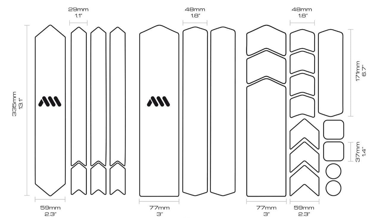 • Full - 18 parts for a universal protection system: downtube, lateral of the downtube, top tube, stays and arrows to extend protection and for cable wear protection or other uses.