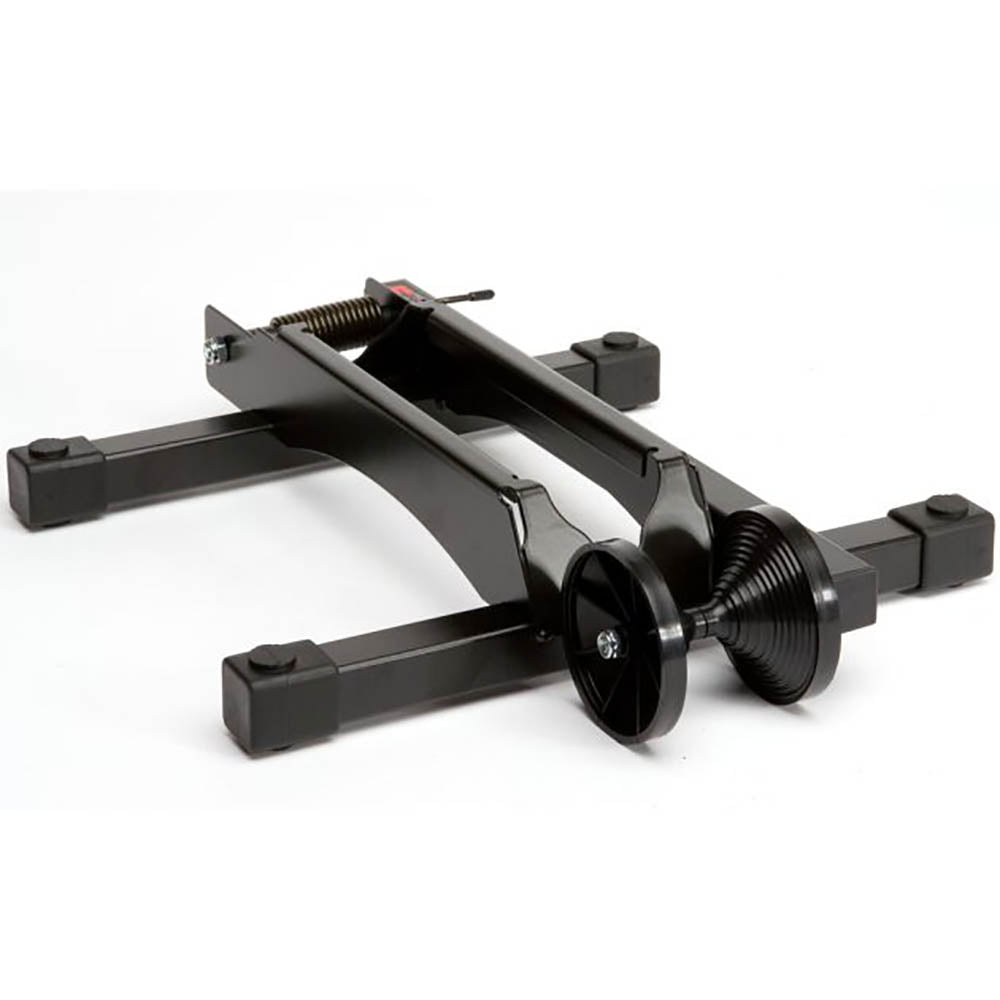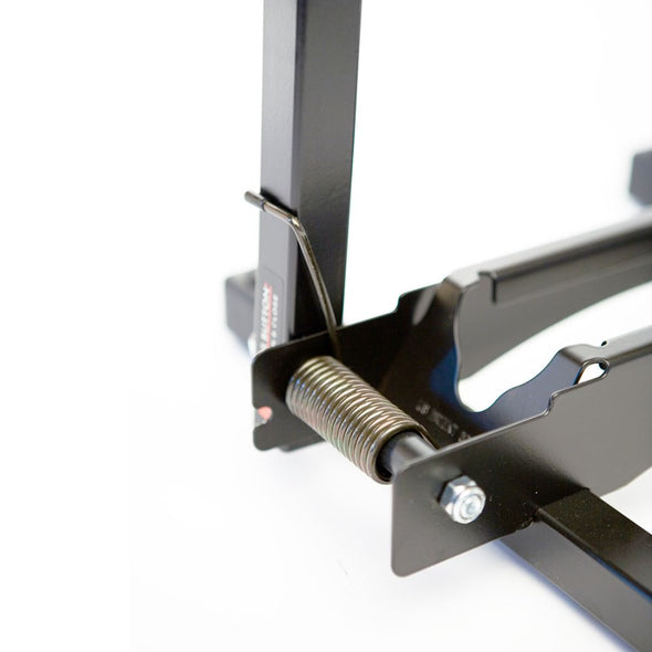 • Spring-loaded design is hands-free – simply roll the bike into the wheel slot and the swing arm holds securely.