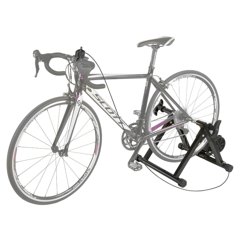 The M-Wave Yoke 'N' Roll 10 Exercise Trainer with Remote features a resistance adjustable remote with 5 settings, 2 oversized steel main tubes with side stability tubes, ergonomic mounting and adjusting handles and a quick release skewer. This trainer fits wheels from 26 to 29 inches and has an adjustable magnet brake by contact pressure. With low noise and foldable frame, this trainer will keep you busy in the winter or during bad weather.