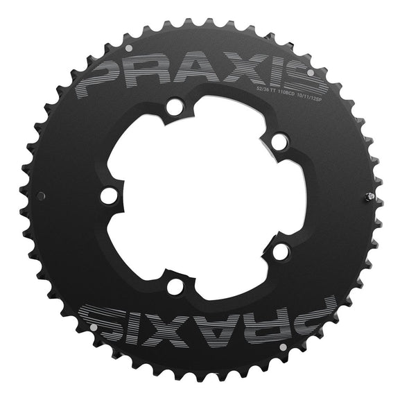Praxis TT road chainrings are the result of relentless testing and tweaking, matched with the best material and manufacturing processes to create some of the smoothest running, most durable and sweetest shifting chainrings available. These TT rings are machined from 7075 T6 aluminium and hard anodized for even more durability. They also feature Praxis’ famous LevaTime Shifting Technology, which boasts synchronized ramps and strategically placed shift pins for perfectly timed shifts every time.
