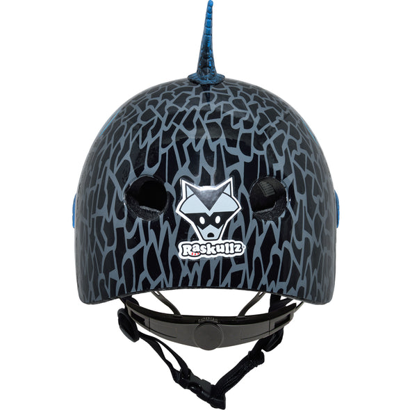 Shark the streets, park and boardwalk with the Raskullz Shark Attax Fit System child size multisport bike helmet. This shark-inspired bike helmet has large piercing eyes on the front of the helmet! The eye-catching 3D shark nose with menacing teeth across the front, and a scaly dorsal fin sticking up on the top will make your little rider look like a real shark! This radical helmet has a sleek, easy-to-use fit system that offers an adjustable, secure fit with a quick turn of the dial and says "Don't mess with this little Sharky!" The child size helmet is recommended for riders 5–8 years old, but will fit anyone with a head measuring 50–54 cm.