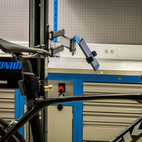 The Unior foldable tablet holder mounts to the Unior’s electric repair stand column and provides optimal placement for tablet.