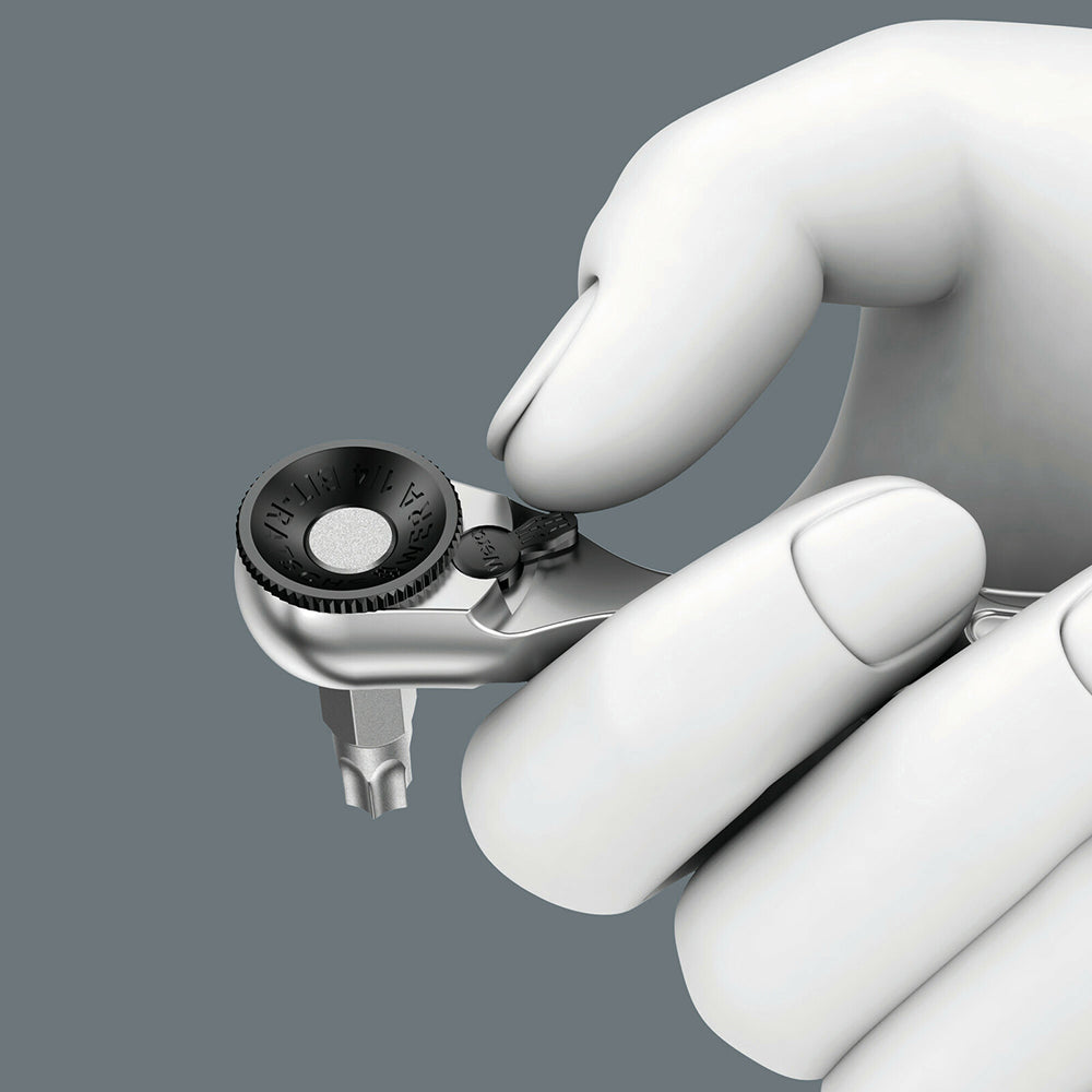 ​The direct bit holder in the ratchet head makes for quick work in small space. Fast switching from left to right. Quick turning over the grooved ratchet head even with just one hand. Small return angle of 6° for precise work. Torques of over 65 Nm. The Rapidaptor bit holder with quick-turn coating can be used as an extension, for lightning-fast bit changes with only one hand without auxiliary tools of even the smallest bit sizes.
