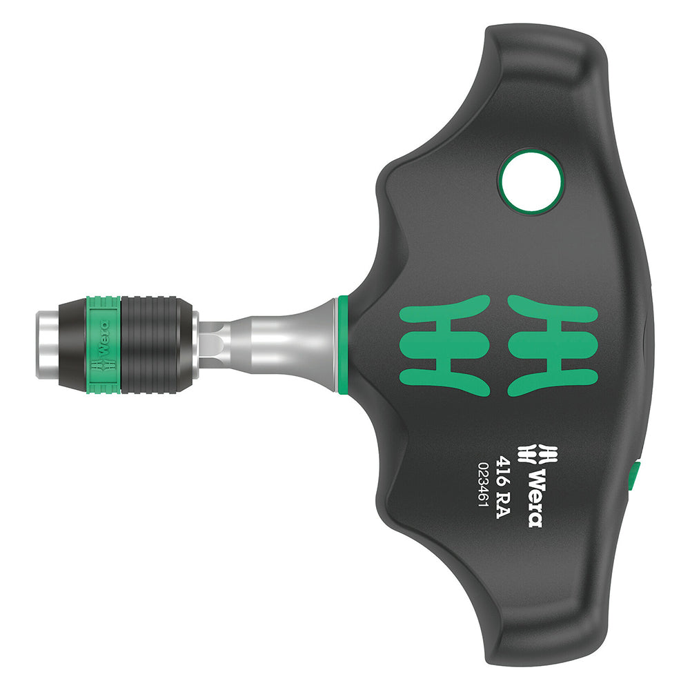 17-piece set in a robust textile box. One 416 RA T-handle bitholding screwdriver with ratchet function and Rapidaptor quick-release chuck for ¼" bits. The integrated ratchet with fine toothing (80 teeth/return angle 4.5°) eases and accelerates screwdriving without having to reposition the tool.